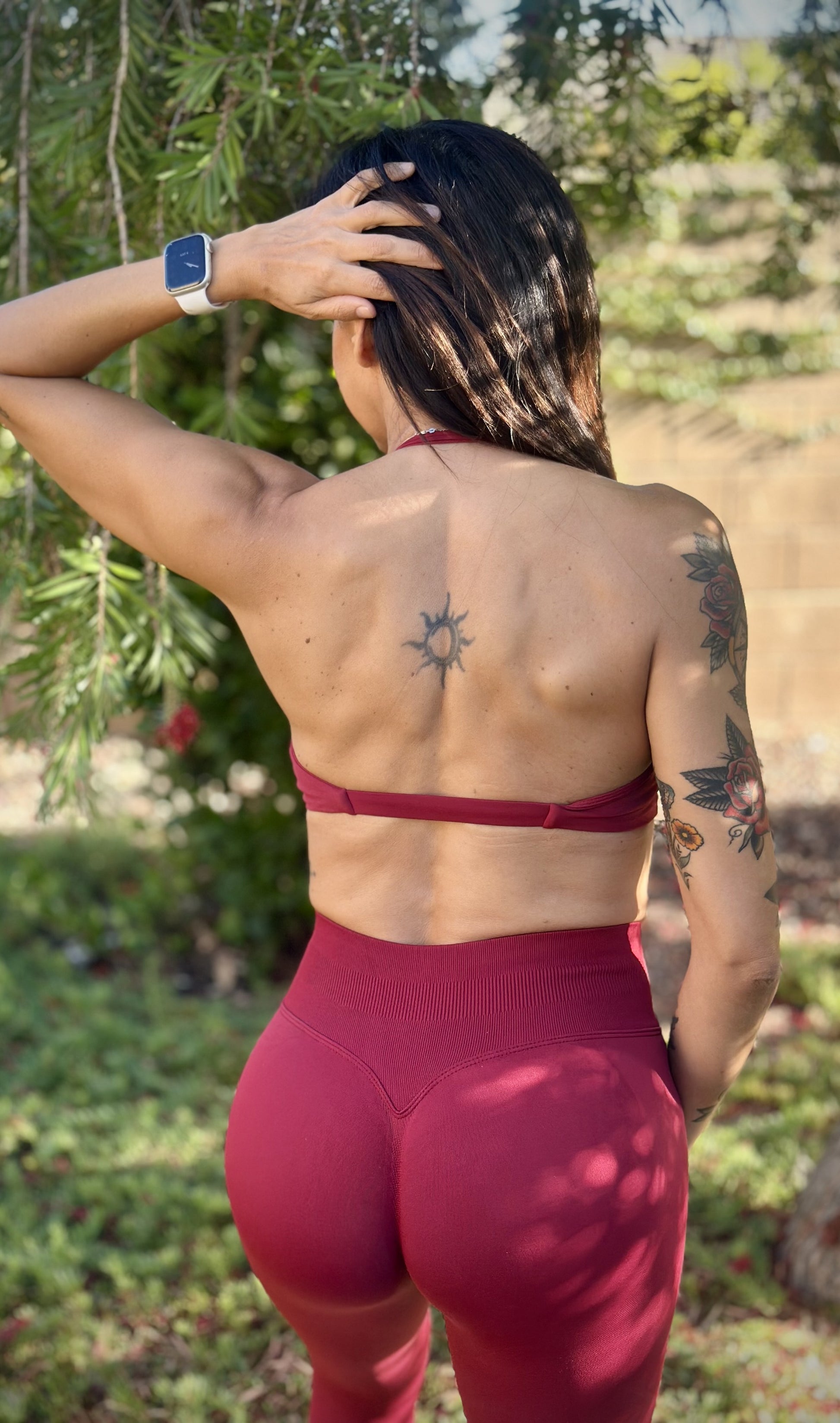 Turn heads and feel unstoppable in the Ruby Glow Halter Set. This deep red halter top with removable padding offers customizable support, while the booty lifting leggings accentuate your curves for a confident, playful look. Perfect for workouts or stylish lounging, it blends comfort with a flirty edge.